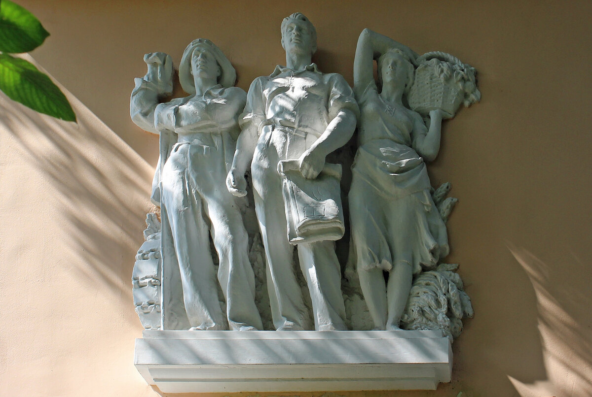 Казалось бы, она всем хорошо известна. Настолько, что вы проходите и уже не обращаете на неё особого внимание. Но оказывается, с двух сторон на арке располагаются барельефы. Я не обращал на них никогда своё внимание... А там "скрыты" две скульптурные композиции - "Советские граждане на работе" и "Советские граждане на отдыхе".