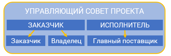 Высший коллегиальный орган управления проектом включает заказчика и исполнителя, в роли заказчика может выступать как сторонний Заказчик, так и Владелец проекта, а в роли исполнителя выступает Главный поставщик. Эффективная работа Управляющего совета заключается в четком распределении ролей между членами, регулярности заседаний и изучении предоставленной достоверной информации о состоянии проекта.