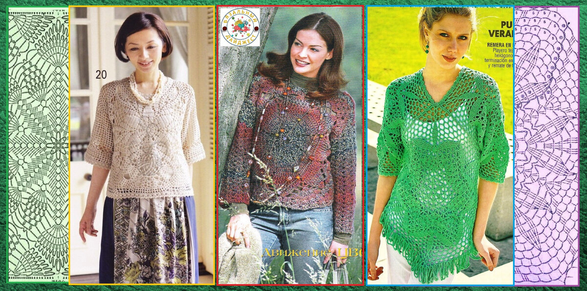 Если применить немного умения и фантазии, то схему круглой салфетки можно скорректировать в широкую полосу, урезав её по бокам слева и справа, а сверху и снизу продолжить до нужной длины. Это уже настоящее конструирование модели, которое представлено в летнем пуловере. Здесь вначале вывязывается центральная полоса от круглого центра с наращиваем сверху и снизу. Затем полотно вяжется поперёк ажурным узором влево и вправо от центральной полосы до нужной ширины изделия. На схемах направление вязания указаны стрелками. С конструкторской точки зрения модель не проста, но вязать её будет интересно.