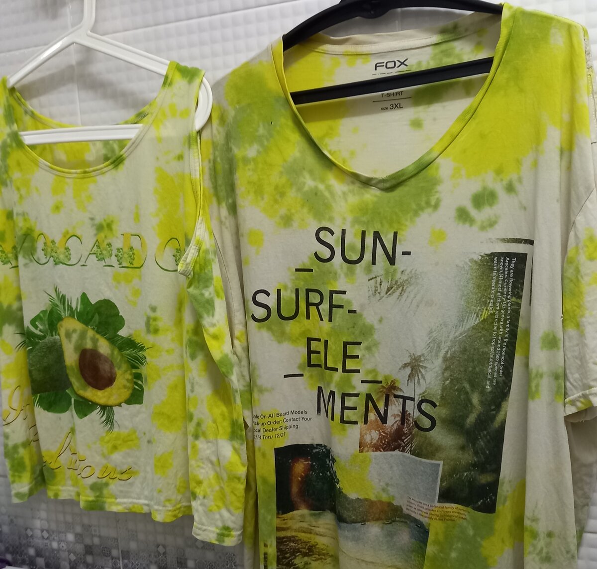 У каждого из нас есть старые, застираннные в пятнах вещи. Но нам жалко их выкинуть или пустить на тряпки. Они мягкие, удобные или связаны с приятными моментами в жизни. Предлагаю дать им новую жизнь. Для этого нам потребуется текстильный краситель (я беру drop) или лучше сразу купить набор для окрашивания одежды. Замачиваем на 20 минут в растворе карбонат натрия из расчёта 50 гр/1 л воды. В наборе drop карбонат натрия уже положен. Пока футболка замачивается, разводим краситель тёплой водой. Если воды добавить побольше, то краски станут более светлыми.ф Сминаем футболку к центру и фиксируем резинками для денег. Выбираем красители тех цветов, которые вам нравятся и хаотично наносим краску. Переворачиваем и опять красим футболку. Убираем в 📦 пакет целофановый и оставляем на 24 часа . Вынимаем из пакета и долго промываем в холодной воде, а потом в тёплой. После этого можно прополаскать в стиральной машинке и отжать. Высыхает футболка и мы получаем такую красоту! Старых пятен теперь