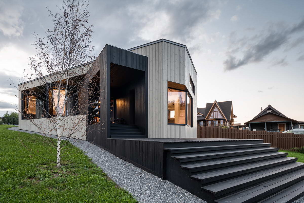 Прямоугольный участок на Истре вытянут с востока на запад. Для наилучшего вида и инсоляции архитекторы развернули внешние стены комнат на 22 градуса относительно внутренних. Во всех комнатах огромные окна в пол, выходящие на восток, из которых видно реку и не видно соседей. Чёрный объём, врезающийся в светлый, служит механизмом для вмещения вида, который ломает форму. Под каждым видовым окном подвесная прямоугольная клумба, чтобы трава подходила прямо к стеклу. Дом сделан полностью из дерева по технологии МХМ, из дерева же сделаны пол и перекрытия. Название: Дом на Истре