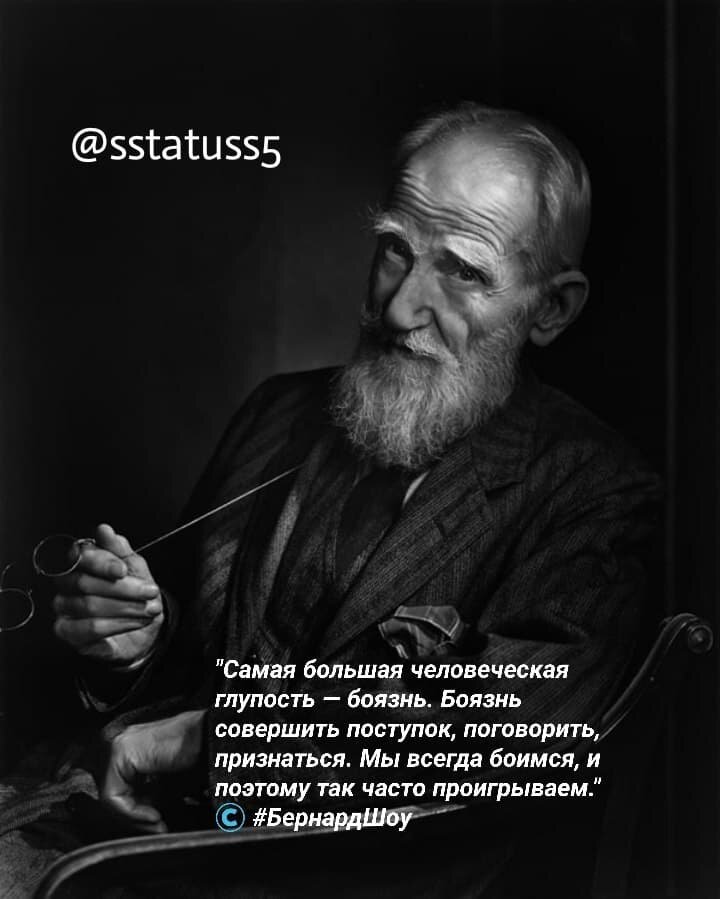 "Самая большая человеческая глупость — боязнь. Боязнь совершить поступок, поговорить, признаться. Мы всегда боимся, и поэтому так часто проигрываем." ©️ #БернардШоу #цитата дня #цитаты и статусы #мысли мудрых TG:t.me/sstatuss5 ПОДПИСЫВАЙТЕСЬ