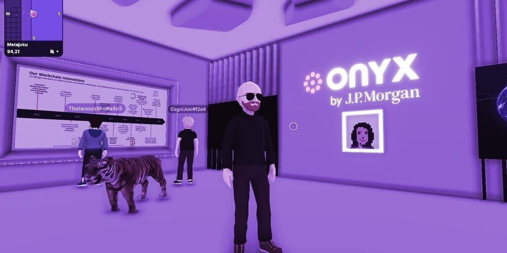 Участок JPMorgan в Decentraland называется Onyx Lounge — это отсылка к одноимённой платежной системе внутри самого банка. В виртуальном пространстве пользователей встречает цифровой тигр и портрет генерального директора банка Джейми Даймона. Пройдя по лестнице вверх, посетители могут просмотреть презентацию об основах экономики криптовалют.