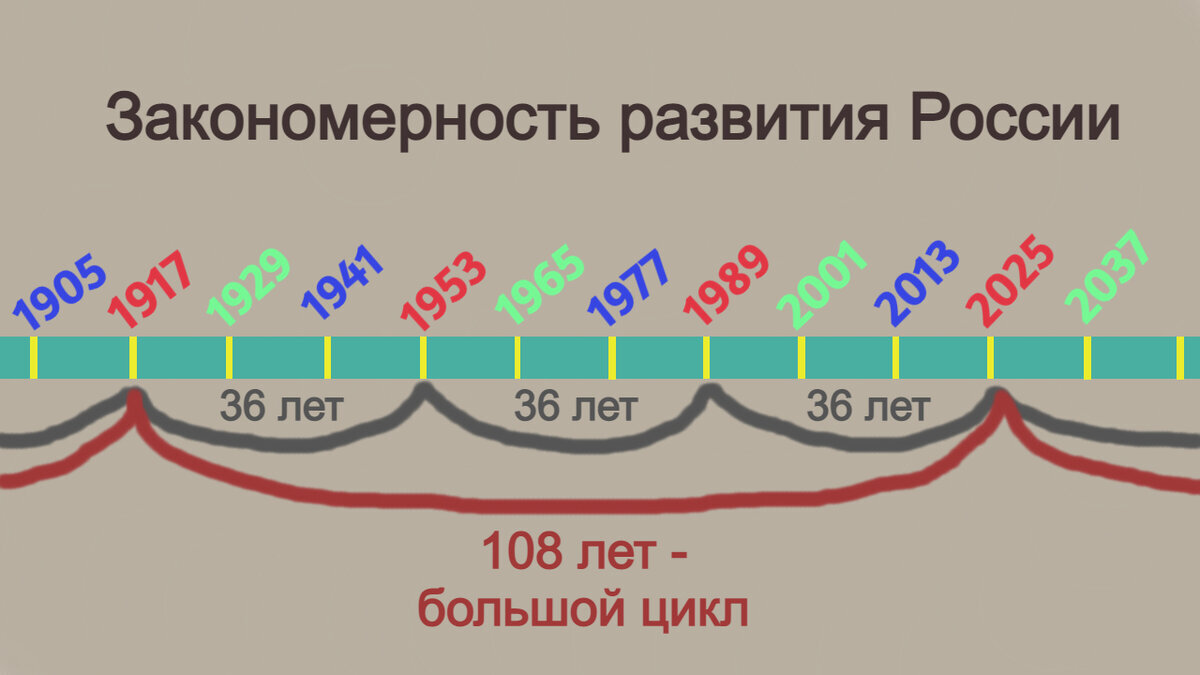 Приветствую вас, товарищи. Думаю, что многие из вас слышали о том, что история циклична и всё то, что происходило десятки лет назад, в наше время повторится вновь. Многие историки и математики могут смело утверждать, что данное высказывание является абсолютно правдивым и существует особая концепция, позволяющая делать прогнозы на будущее, основываясь на прошлом - концепция исторического циклизма. Конечно, данная идея имеет свои погрешности в годах и никто не гарантирует планируемого исхода со 100% вероятностью, но вполне возможно отследить закономерность и создать возможный прогноз. Исторический циклизм Если говорить по простому, то весь исторический промежуток можно поделить на небольшие сектора - шаги, длиной в 12 лет. Три шага образуют малый цикл, состоящий из 3 временных изменений: Совокупность из 3 малых циклов образует так называемый "Большой цикл". Соответственно, он длится 108 лет. Его главной задачей является возможность показать глобальное изменение в государстве. Пример: