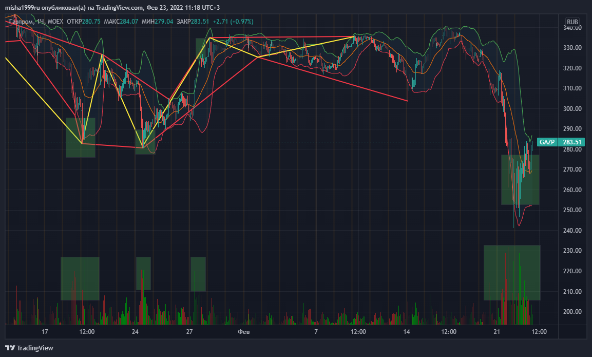 Так же линии Боллинджера показывают начало восходящего тренда, слабо но показывают. Лучшей точкой входа в данной ситуации считаю 285,5. при её пробитии. Так же минимальный процент который нужно забирать это 9,5% на уровне от 313 за акцию. Так же рисунок начинает напоминать фигуру "двойное дно", а это значит что максимум что можно будет забрать на локальном уровне это 15% на уровне