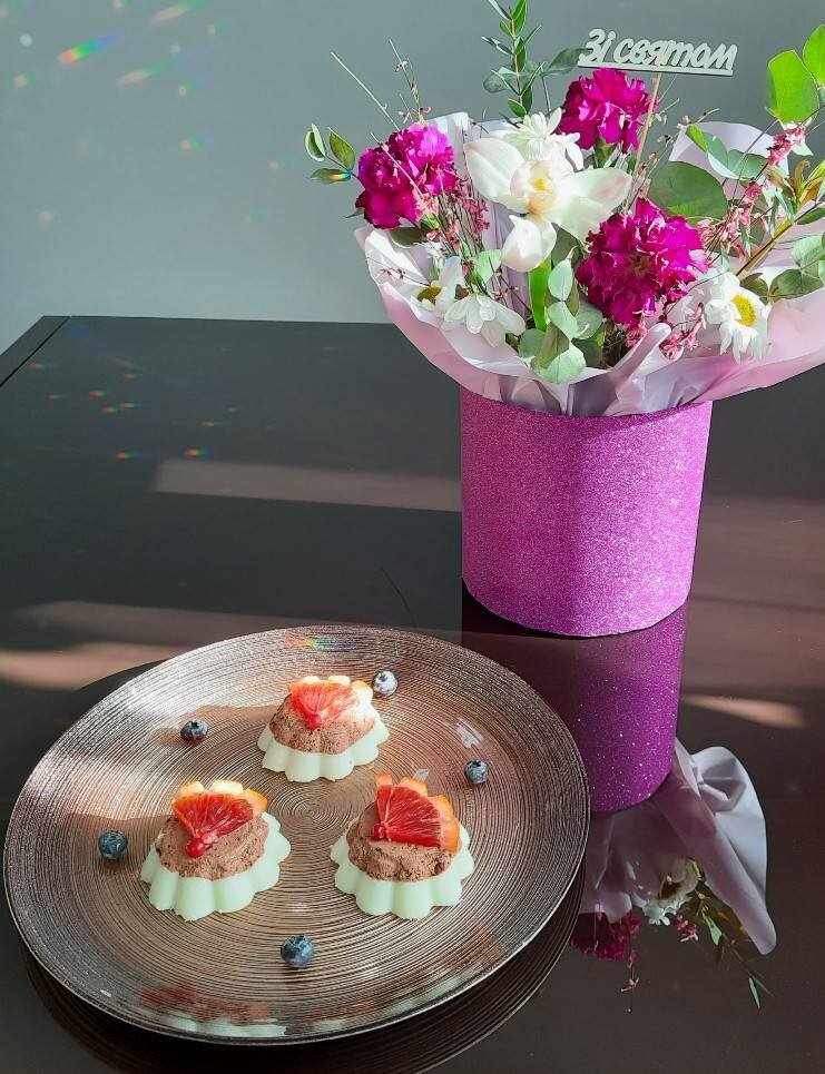#вихідні Ингредиенты: Шоколадное суфле, желатина, сливок 20-33%, молока, Сахар , какао, Молочное желе, молока, желатина, Сахар , Тёртый белый шоколад , Ягоды, апельсин для украшения Способ приготовления: Сливки перетираем с сахаром. Молоко кипятим, добавляем желатин, хорошо перемешиваем, остуживаем и соединяем со сливками. Добавляем какао, перемешиваем и наливаем первым слоем в смазанные маслом формочки для маффинов. Отправляем в холодильник до застывания. Молоко доводим до кипения, добавляем тёртый белый шоколад, хорошо перемешиваем. Добавляем желатин и снова тщательно перемешиваем. Остуживаем и наливаем вторым слоем в формочки. Отправляем в холодильник для застывания. Приятного аппетита!