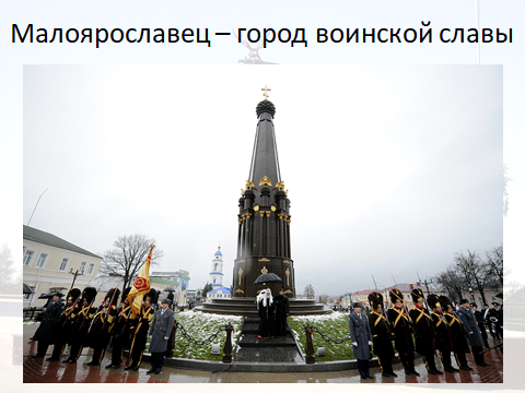 «За мужество, стойкость и массовый героизм, проявленные защитниками города за свободу и независимость Отечества», 7 мая 2012 года Указом Президента России Малоярославцу было присвоено звание «Город воинской славы».