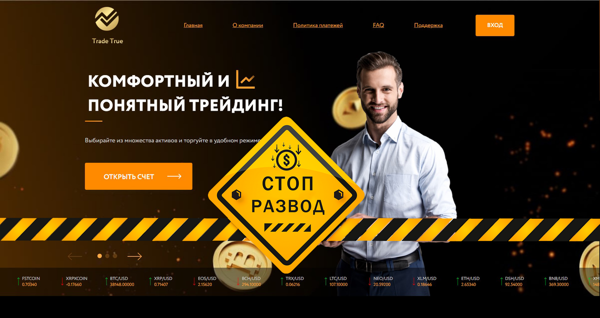 Trafetrue мошенническая организация прикрывающиеся брокерской деятельностью. Однако это наглый мошенник, который ворует ваши деньги. Сегодня СтопРазвод разберет почему нельзя доверять этому проекту. Обзор сайта Сайт встречает вас всевозможными громкими заголовками, которые обещают вам огромные заработки. Проект предлагает вам торговать криптовалютами, при этом имеет достаточно широкий список активов. Однако на сайте представлены достаточно мало информации. Везде зазывы зарегистрироваться, однако мало информации о самой фирмы. В разделе «О компании» предоставлена инструкция о том, как открыть счет. Но информации о том, кто создал проект, нет. А честный человек не боится скрывать свою личность. В лицензии у брокера написано, что она выдана в 2021-м году. Однако домен зарегистрирован в 2022-ом году. А значит это подтверждает, что это не долгоиграющий мошеннический проект. Пользовательское соглашение Соглашении имеет не очень много пунктов, однако и эти пункты рассчитаны на то, что их никт
