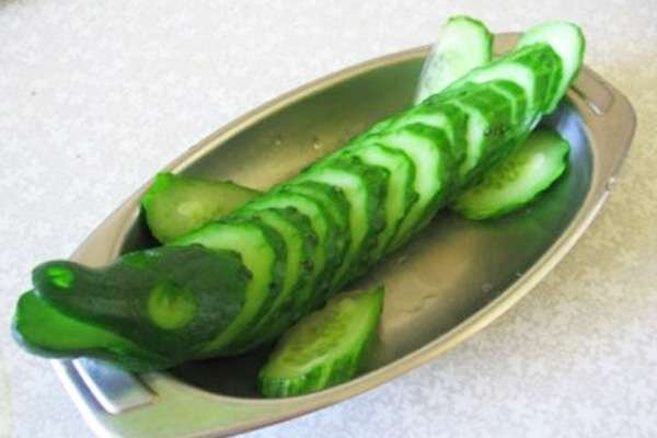 Сделать из подходящего плода крокодила, на самом деле, весьма просто! Нужен только острый нож, зауженный темный край огурца со стороны плодоножки и некоторые навыки. Этот симпатичный позвоночный вальяжно расположится сбоку любой тарелки и станет оригинальным элементом дизайна блюда. А сделать его очень просто. Итак, со стороны плодоножки вырезаем длинный треугольник – это крокодилья пасть. Остальную часть плода режем косыми пластинами и выкладываем их на блюдо с небольшим смещением. На месте глазок вырезаем небольшие ямки, вставляем в них ягоду калины или клюквы, закрепив их кусочком зубочистки. Из сыра или вареного белка можно вырезать зубы и закрепить их в «пасти». Посмотрите еще вариант крокодила из огурца. Вы можете повторить любой из них, если приложить некоторые усилия и желание.