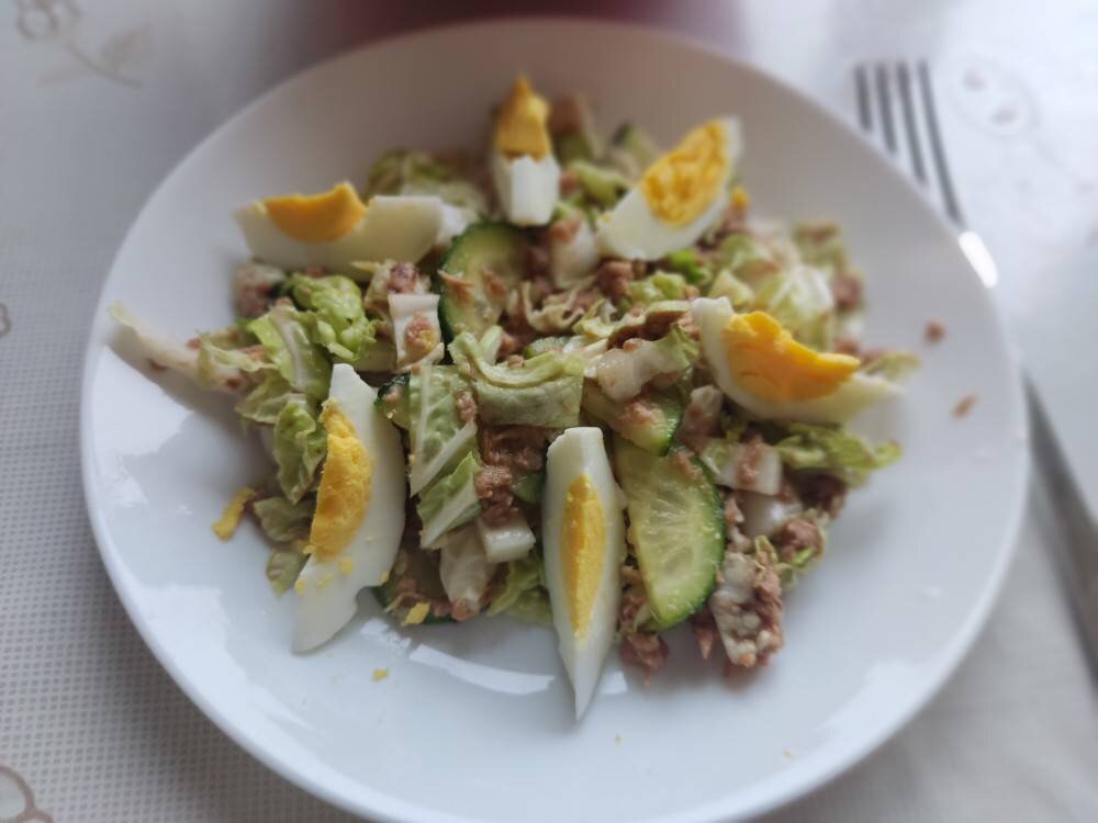 #меню Ингредиенты: пекінської капусти (не великої), огірок середній, тунця в олії, яйця, соєвого соусу Способ приготовления: Капусту нарізати крупно. Додати нарізаний огірок,тунець та соєвий соус(за бажанням). Перемішати та зверху викласти варене яйце(також за бажанням). Соєвий соус і яйце добавила сама від себе.