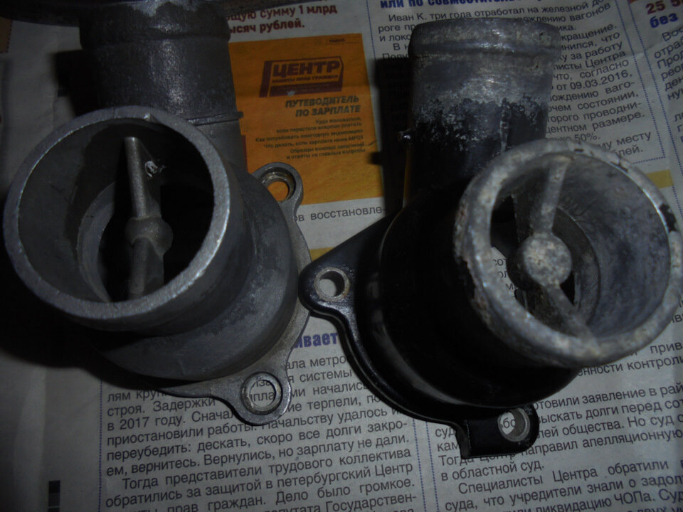 В 2016-м стала подтекать печка, в один прекрасный момент заклинил термостат. Я тогда работал механиком учебного гаража и преподавала Устройство и Техническое обслуживание автомобилей в техникуме. Был похожий случай на учебной Гранте поэтому сразу определил неисправность: нижний патрубок холодный, в РБ повышенный уровень, жидкость выкидывает. Помню температура с 90 до 120 подскочила через 25 метров. Пробовал постучать по нему, без толку. В магазине как назло не было ни элементов ни фланцев и пришлось взять термостат в сборе- Luzar. Через 3 месяца ситуация повторилась. Потом нашёл фланец и поставил его. Через месяц термостат заклинил уже в открытом положении. Попытка выгнать пробку через дроссельный узел результата не принесла. Причем пробка и термостат? Термостат работает только тогда когда покрыт жидкостью. Если