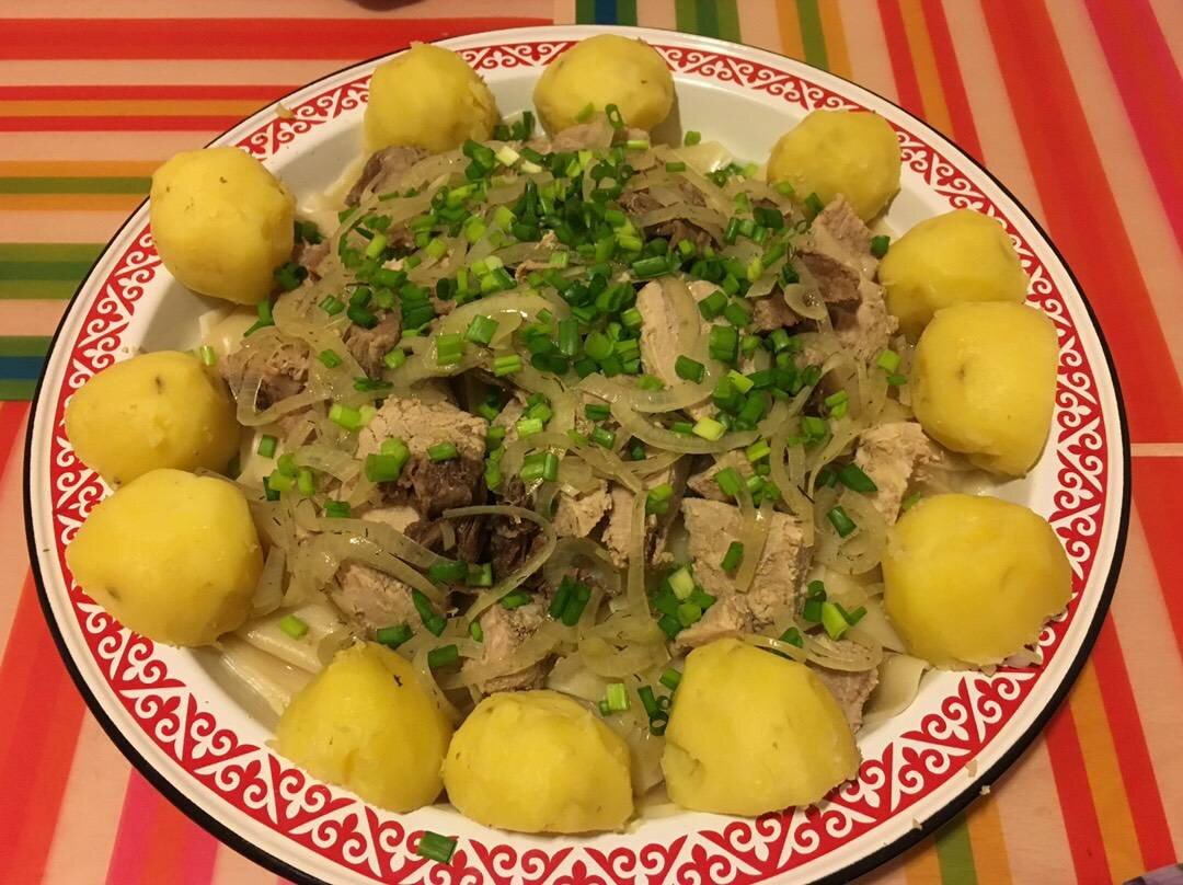 Собираем наше блюдо. В большую тарелку выкладываем слоями: отварные листы для бешбармака, далее нарезанное на кусочки мясо, следом идёт отварной лук, слегка поливаем бульоном все. По краям выкладываем отварной картофель и посыпаем все зелёным луком. Готово. Приятного аппетита!