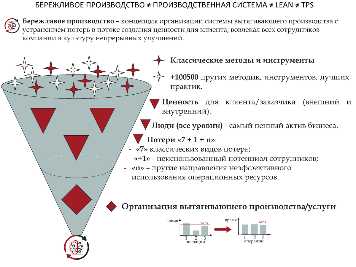 Начнём с того, что бережливое производство - это не производственная система, это не lean и это не Toyota Production System. Бережливое производство – это концепция. Производственная система – это система компании, использующая свои операционные ресурсы для производства продукции или услуги. Lean– это система методов и инструментов созданная на основе Toyota Production System. Toyota Production System – это производственная система компании Тойота. Очень важно разделять такие близкие по смыслу лучшие практики и такие далёкие друг от друга в применении.