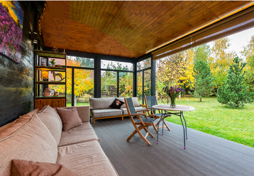 Планировка дома должна отводить террасе особое место. Это место должно быть такое, чтобы терраса выходила на запад, так как во время восхода, солнце максимально будет освещать это место, и мы сможем наслаждаться его лучами в полной степени. Террасой в строительной практике считается летняя пристройка к дому в виде площадки под крышей, поддерживаемой столбами. Она может иметь исполнение открытой или застекленной. В нашем климате наиболее популярна встроенная в дом застекленная терраса, называемая в простонародье верандой. Чаще всего веранда – это простой уютный уголок, который может превращаться, по необходимости, то в столовую, то в помещение общего пользования. Также она может быть оборудована под летнюю кухню или теплицу для выращивания ранней рассады. Касаясь размеров веранды, то она в ширину не должна быть меньше 2 метров. Самое лучшее расположение для веранды – южная или юго-западная, или на крайний случай западная сторона дома. Если вы задумали строительство довольно большого д