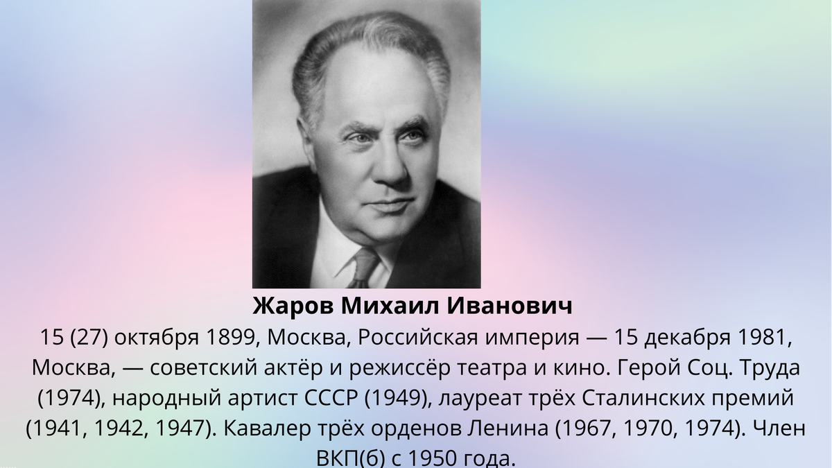 Михаила Ивановича Жарова знают все, особенно поколение, рождённое в прошлом веке. Звучит смешно, мне слегка за 50, а я уже особа, рождённая в прошлом веке.