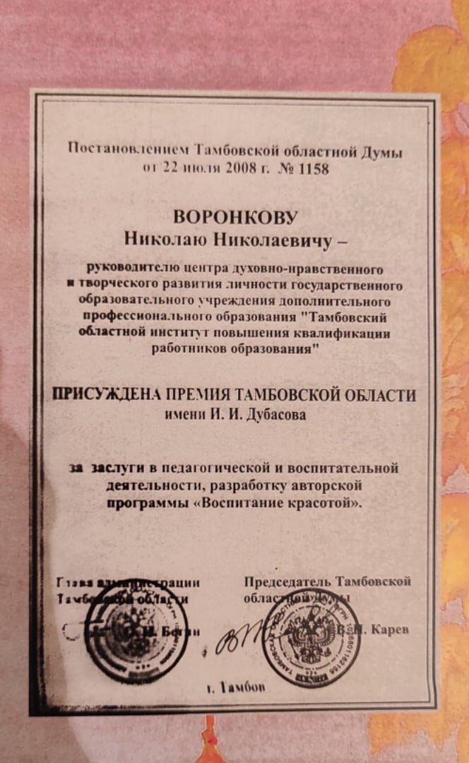 Создание региональной общественной организацииского развития граждан «Воспитание красотой». Н.Н. Воронков назначен председателем Тамбовского отделе