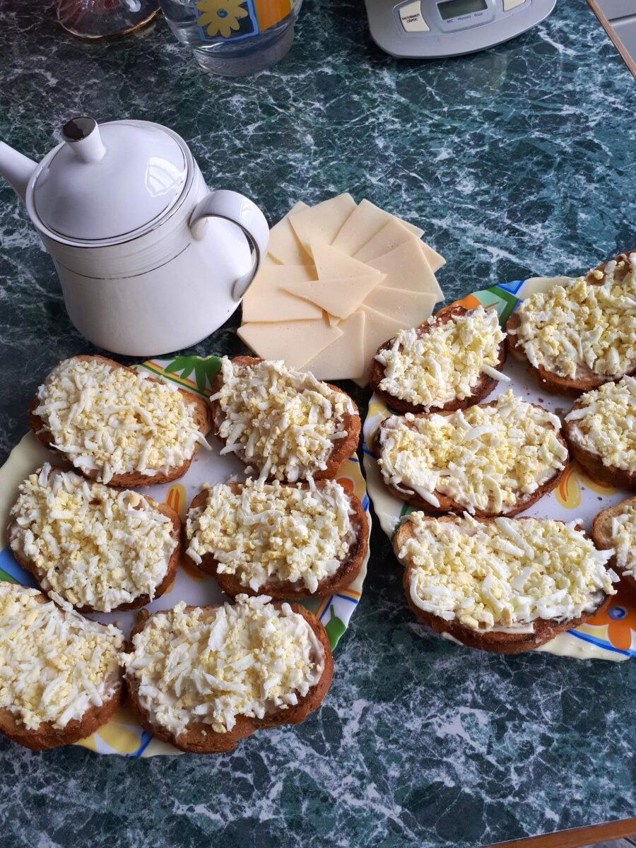 БУТЕРБРОДЫ "ЁЖИКИ" Друзья, хочу поделиться простым и очень быстрым в приготовлении блюдом. Можно даже сказать, лёгким перекусом. Эти бутерброды прекрасно подойдут, как дополнение к обеду. А могут занять место и на праздничном столе, если их оригинально украсить. Например, сделать из яйца и половинки помидора грибочек и установить его в центре блюда. Или уложить их на листья свежего салата. Вариантов много. Давайте же мы приготовим эти бутерброды вместе. НАМ ПОНАДОБИТСЯ: Яйцо 4 шт. Хлеб белый или батон Майонез 100 гр Чеснок по вкусу (много не надо) Отварим яйца в течение 8 минут после закипания. Остудим их и очистим. Хлеб или батон, обжарим до лёгкой румяности на сухой сковороде. Очистим чеснок. В небольшую чашку выложим майонез и добавим, пропущенный через пресс чеснок. Всё перемешаем. Яйца натрём на крупной тёрке. Приготовим плоское блюдо. Я взяла вращающееся, для торта. Для меня это блюдо оказалось очень востребованным в сервировке стола. Торты, пироги, бутерброды,