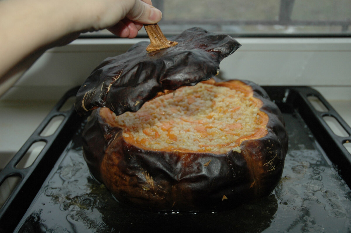 Первый раз я попробовала так использовать тыкву давно, когда у меня ещё не было своего огорода. Знакомая угостила тыквой с дачи. Я долго думала, как её использовать: сделать пшённую кашу с тыквой, сделать тыквенные оладьи? Начала искать рецепты и тут то мне и попался рецепт с запечённым внутри мясом с гарниром. Тыкву я тогда немного передержала и получилась она не совсем красивая. Но верхняя кожица легко снималась, а под ней была хорошо пропечённая оранжевая мякоть, заполненная мясом, а сверху рис с луком. морковкой и кусочками тыквы. С тех пор я стала частенько пользоваться этим рецептом. особенно после того, как стала сама выращивать тыкву. Этим я и хочу с Вами поделиться. Сегодня я делаю на гарнир гречку с луком и морковью. Это просто гарнир. Утку к гарниру я уже приготовила отдельно. Гречку можно было бы приготовить в чугунном горшке, но я решила использовать вместо него обычную тыкву, у которой верхнюю часть срезала вместо крышечки, Вынула семечки из середины и слегка поскоблил