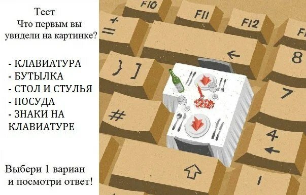 Ключ к этому тесту: -КЛАВИАТУРА - Вы молоды и в меру нахальны. Интересного пропускать не любите. Знаете себе цену, но не завышаете ее. В то же время в вас живет очень тонко чувствующая и сопереживающая, нежная натура. - БУТЫЛКА - В отношениях с другими людьми вы часто берете на себя роль воспитателя и советчика. Одним из ваших самых больших недостатков является то, что вы оцениваете себя слишком критично. Если вы не пересмотрите отношение к себе и своим достижениям, то это может привести вас к серьёзному стрессу. - СТОЛ И СТУЛЬЯ - Вы – отличный друг и любящий партнёр, который заслуживает всяческих похвал. Недаром близкие люди доверяют вам и часто обращаются за советом! - ПОСУДА - Вы живёте размеренной и организованной жизнью и обладаете великолепно развитыми ораторскими и коммуникативными способностями. -ЗНАКИ НА КЛАВИАТУРЕ - вы являетесь человеком, который всегда обращает внимание даже на самые мелкие детали. У вас есть глубокое чувство гармонии, и вы великолепно понимаете людей. Имен