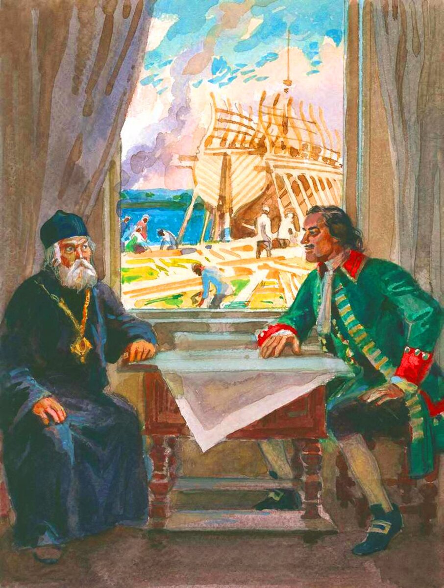 (Цикл поэтических статей к 350 летию Петра I.) "Здесь жил народ до нашей эры; По берегам могучих рек Из камня статуи Венеры Тесал и ставил человек. Теперь эпоха неолита Явила, что землёй покрыта Лежала, тайный смысл храня, Внизу у стен монастыря - Из камня женщина нагая. В те дни ещё жил царь Иван И сам святитель Митрофан Служил, на труд благословляя, Людей идущих каждый день Из ближних сёл и деревень. По берегам реки Воронеж Росли дремучие леса. И шапку с головы уронишь Когда глядишь под небеса На мачты сосен корабельных, На высь и ширь дубов артельных, На ладный строй могучих лип, На бук, что намертво прилип И гнёт осину мощной кроной. Зимой здесь други-казаки Рубили струги и станки Для войска и весной зелёной В станках колёсных, налегке, Свозили сотнями к реке. Царь дал такую установку: - «Кузьма Титов, по чертежам, В лесу проводит заготовку. А принимать я буду сам: На галеасы и галеры, Каторги, струги и брандеры Детали новых кораблей. На верфи, возле стапелей: Пластины, брусья, до