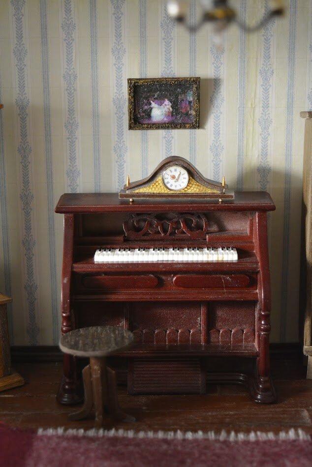 Продолжаем обзор домика. Первые две комнаты расположились здесь и здесь В третьей комнате главный герой - пианино. Его я купила, все остальные предметы сделаны мной в масштабе 1:12 На фото увидела, что пора произвести влажную уборку, простите за пыль, плиз Общий вид комнаты И несколько других ракурсов Всем спасибо за просмотр!
