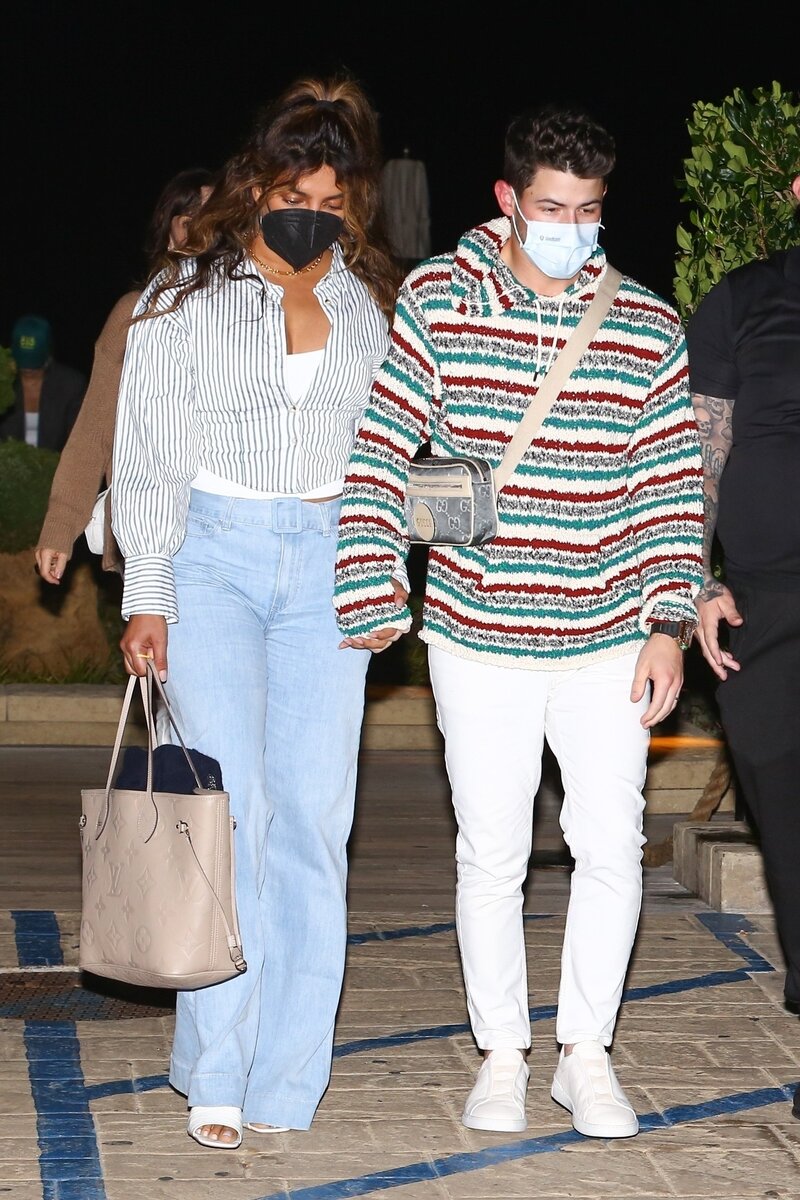 Новоиспеченные родители Ник Джонас и Приянка Чопра устроили себе романтический ужин в ресторане Nobu — в одной из самых популярных гастрономических точек на карте Малибу. Для влюбленных это свидание стало первым с момента рождения дочери в прошлом месяце — для этого звездная пара прибегла к суррогатному материнству. Для особенного вечера Приянка подобрала стильную casual-комбинацию с полосатой блузой, джинсовыми брюками-клеш и бежевой сумкой Louis Vuitton, а ее супруг остановил выбор на сочетании толстовки в разноцветную полоску, белых джинсов и сникерсов в тон низа. Читайте также на нашем сайте: 5 роковых ошибок девушек plus size, или Почему у вас не получается выглядеть стильно в любом весе #ник джонас #приянка чопра #стиль #мода #мода и стиль #гардероб