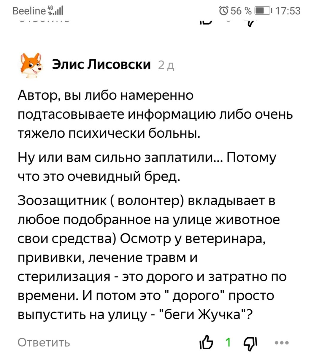ФЦитата : "... И потом это " дорого" просто выпустить на улицу - "беги Жучка"? " " Давайте смотреть шире. Закон о том, что отловленных собак, после стерилизации (тоже не бесплатно, правда?) и недолгой передержки нужно выпустить обратно на улицу - продвигает именно кинозащита (теперь я буду называть это так, в более ранних статьях - "зоозащита" ). Именно, как вы и сказали- "Беги, Жучка." Это не дискредитирует лично вас, как волонтера. Но собирательный образ зоозащиты, тем не менее, состоит в том числе из черт, которые лично вам могут быть не свойственны. Пока моё мнение стабильно - именно зоозащитнику (! СРЕДНЕСТАТИСТИЧЕСКОМУ) более свойственно вот это "Беги, Жучка." И даже после больших вложений в эту самую Жучку. ____________________________________ Комментарий был на статью