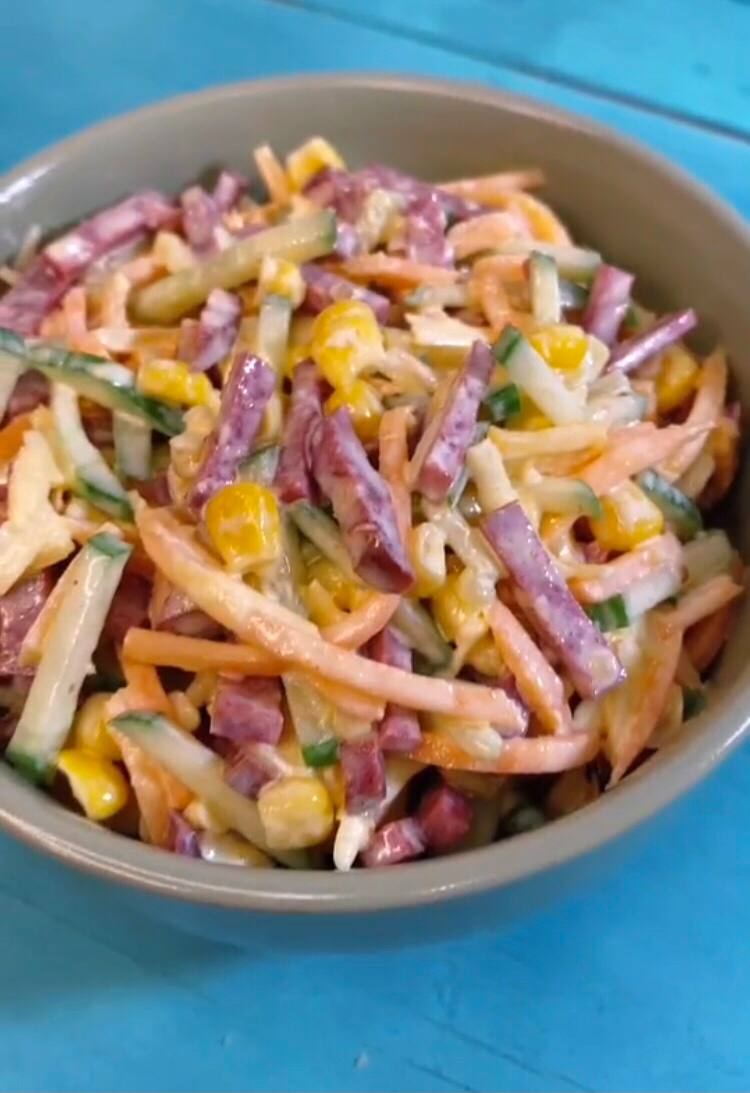Салат получается очень сытным, подойдет к любому столу. Готовится из простых ингредиентов и получается очень вкусным! Для приготовления понадобится: 1. Нарезаем огурцы соломкой 2. Так же нарезаем копченную колбасу и добавляем ее туда 3. Добавляем корейскую морковь, тертый сыр и кукурузу 4. Заправляем майонезом и всё хорошо перемешиваем 5. Салат готов! Всем приятного аппетита! Спасибо за просмотр! Подписывайтесь и ставьте лайки, если понравился рецепт