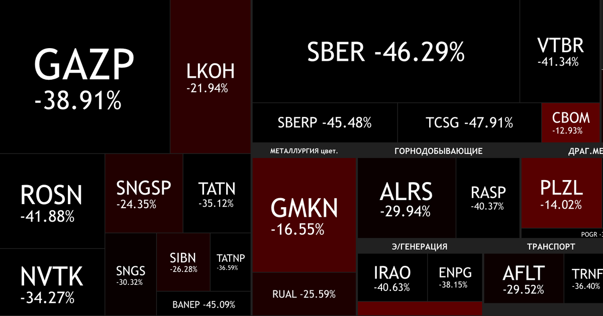 По состоянию на 15:58 индекс Мосбиржи теряет почти 33%, индекс РТС — более 36%. Сильнее рынка просели акции «Сбера» — котировки банка опустились на 48%, до ₽107 на акцию. Бумаги «Газпрома», «Роснефти» и «Лукойла» снижаются в пределах 40%. Сдерживающий эффект оказывает приостановка торгов на биржах — торговые площадки работают в режиме дискретного аукциона. Котировки российских компаний на Лондонской бирже демонстрируют более существенное снижение — депозитарные расписки «Сбера» на открытии торгов подешевели более чем на 70%, до $2,45 за бумагу. В РБК отметили, что сегодняшнее падение фондовых индикаторов стало рекордным в истории российского рынка. В моменте обвал индекса Мосбиржи достигал 45%, индекса РТС — почти 50%. Интервеции ЦБ В ходе утренних торгов доллар дорожал до ₽89,6, а евро — до ₽99,99. Банк России, впервые с 2014 года объявил о начале собственных валютных интервенций. Чтобы стабилизировать ситуацию на рынке и ослабить давление на рубль ЦБ начал продавать иностранную ва