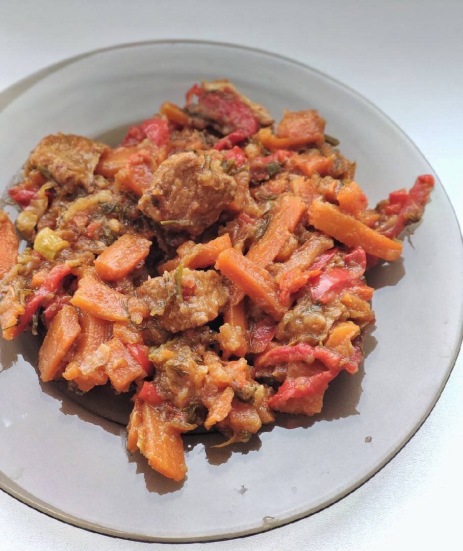 ~107 ккал 🍖 Ингредиенты: лук репчатый, гр морковь, гр свинина (у меня вырезка), гр помидоры, гр болгарский перец, гр зелень (лук, укроп, петрушка), соевый соус, гр пряная смесь, оливковое масло Способ приготовления: Лук режем полукольцами и обжариваем в антипригарной глубокой посуде до карамелизации. Мясо режем кубиком и закидываем к луку. Тушим до испарения жидкости, слегка обжариваем. Готовим пряную смесь. У меня это: 10 гр сванской соли, 5 гр чёрной соли, 3 гр смеси паприки и чили, 2 гр чёрного молотого перца. Закидываем пряную смесь, заливаем соевый соус, тушим минут 5-10. Морковь режем соломкой. Добавляем к мясу и тушим до мягкости, примерно минут 20-30. Перец и помидоры режем соломкой. Закидываем и тушим ещё минут 20-30. Режем зелень. Добавляем к мясу с овощами и готовим все вместе ещё минут 10.