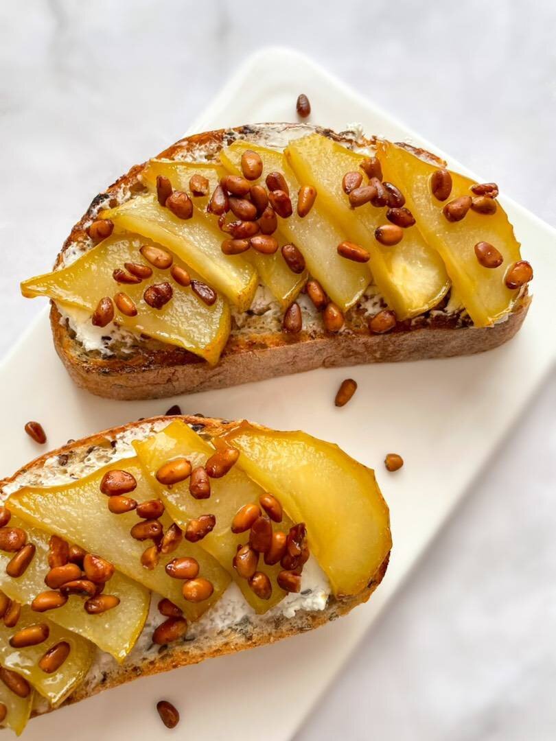 Делюсь с вами рецептом вкуснейшего завтрака - мёд, орешки, груша, томленая в карамели 😋 Давайте готовить🔥 #брускетта #завтрак #бутерброд Ингредиенты: Багет или чиабатта , Творожный сыр, Твёрдая груша , Сливочное масло, Мёд , Орешки кедровые или любые другие Способ приготовления: Грушу нарезать слайсами. На сковороду кусочек сливочного масла и мёд. Обжарить грушу с двух сторон по 1-2 минуты. Орехи обжарить в оставшейся от груш карамели. Если орехи не кедровые, то предварительно слегка их измельчить. Хлеб обжарить на сухой сковороде с двух сторон до золотистой корочки. Смазать хлеб творожным сыром и выложить груши. Присыпать орешками и полить мёдом. Подавать горячими! Приятного аппетита!😋☺️