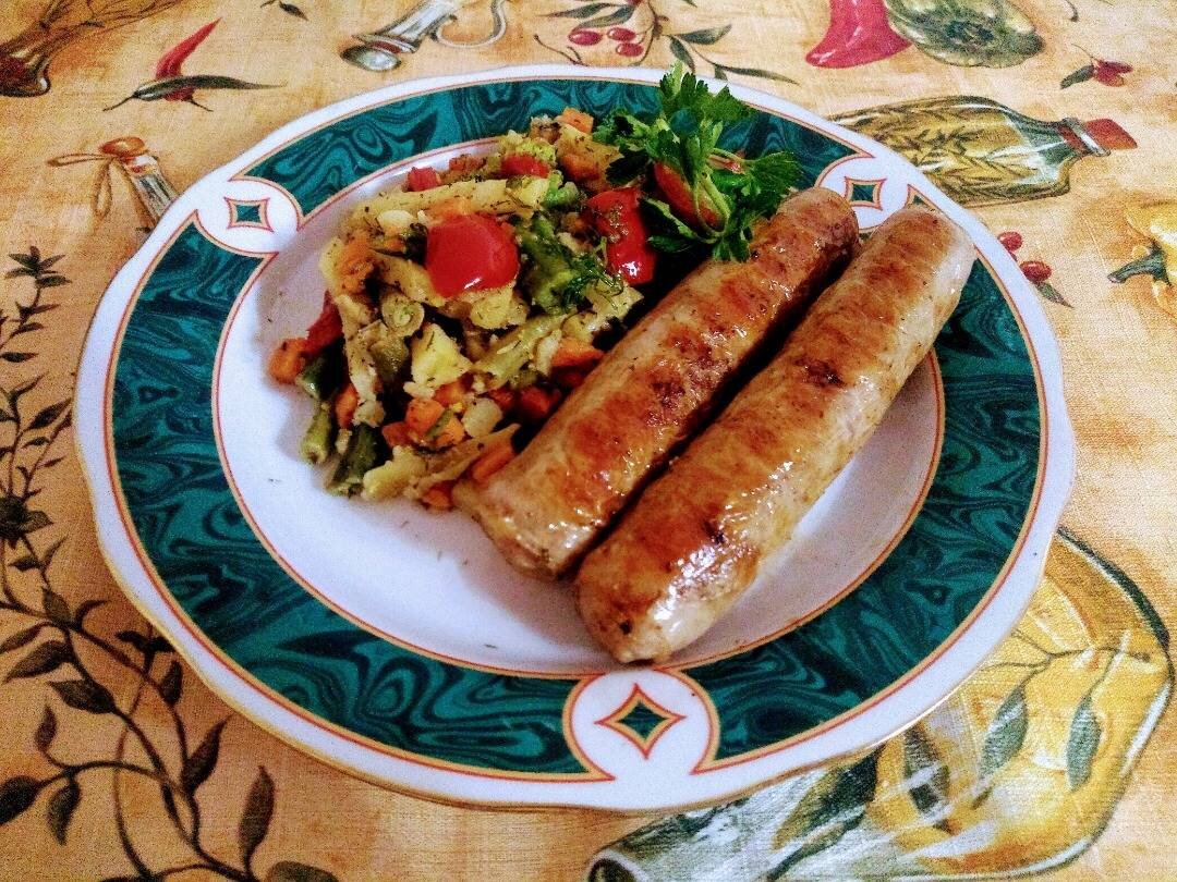 #23февраля Сейчас не проблематично приобрести готовые купаты, или домашние колбаски, так они еще называются, в магазине полуфабрикатов. В идеале состоят они из мяса, чеснока, специй и лука. По необходимости добавляется еще и сало. Оно может быть рубленым или измельченным на мясорубке. В зависимости от того, из чего изготовлена колбаска, будут варьироваться сроки приготовления. Ингредиенты: Колбаски для гриля (свинина- говядина 4 шт.), Соль, Перец душистый, Лист лавра, Сливочное масло, Для гарнира:, Овощи для жарки, Перец болгарский, Капуста брокколи, Растительное масло для жарки, Соль, перец Способ приготовления: Сначала готовим купаты. Купаты заранее разморозить и положить их в кастрюльку. В кастрюльку наливаем чистую воду. Она должна полностью покрывать колбаски в процессе варки. Добавить в воду соль, душистый перец, лавровый лист. Установить кастрюльку на плиту, на средний огонь, и отварить после начала кипения около 5-8 минут. Колбаски можно немного пошевелить лопаткой, чтобы они н
