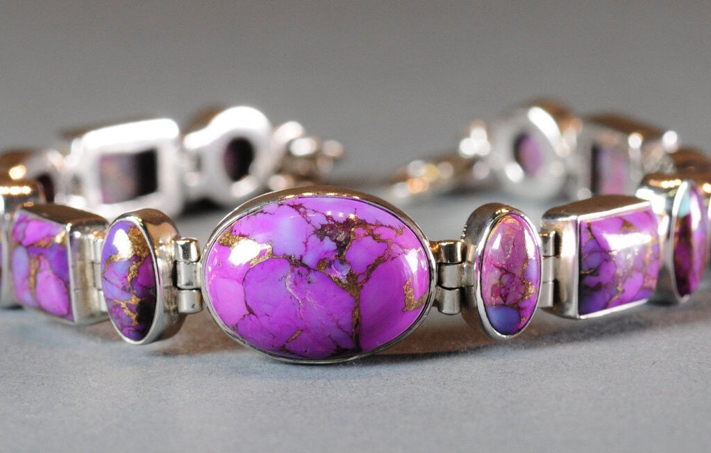 У ювелиров можно встретить не очень дорогие украшения с красивыми лилово-фиолетовыми камнями, которые продаются как натуральная бирюза. Многие уверены, что это действительно натуральный камень, можно встретить упорные споры на этот счет. Конечно, если присмотреться, станет понятно, что минерал вряд ли природный – между кусочками, похожими на бирюзу, блестят золотистые прожилки. Но люди сейчас настолько дезориентированы огромным количеством и разнообразием «улучшенных» и синтетических камней, что могут действительно верить словам продавца о натуральности. Конечно, природная бирюза – исключительно голубой камень, оттенки могут быть разными, от истинно бирюзового до блеклого едва синеватого. Но, поскольку бирюза – минерал рыхлый, он легко поддается окраске, поэтому очень давно из малоценной бледной бирюзы научились делать разноцветную. Так же и с фиолетовой бирюзой, у нее, кстати, есть название, которое относится к произведенной в США вот такой формации с золотыми прожилками: «бирюза моха