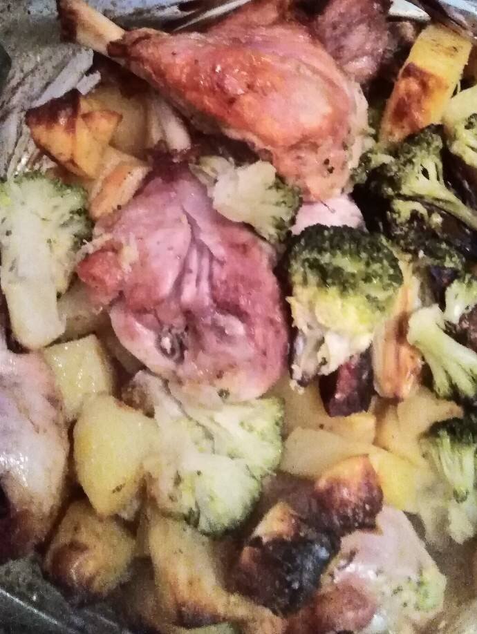 Ингредиенты: Голеень куриная 1уп(6шт), Картофель, Брокколи замороженная, Соль и приправа для курицы по вкусу Способ приготовления: Картофель помыть, очистить и нарезать кусочками среднего размера. В рукав для запекания сложить голени, картофель и брокколи. Добавить туда же соль и приправу. Завязать рукав с обеих сторон. Попереворачивать рукав с содержимым, чтобы всё перемешалось. В противень уложить рукав. Проткнуть рукав сверху в нескольких местах. Выпекать в духовке при температуре 230 градусов 1час 20 минут Приятного аппетита