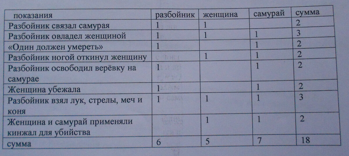 Абсолютно достоверны два события. Первое — разбойник овладел женщиной. И второе — разбойник забрал оружие самурая. Здесь показания трёх лиц сходятся. Остальные 6 событий не находят общего подтверждения.