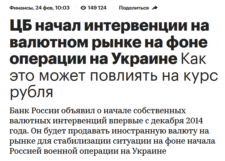 После объявления 24.02.2022 Президентом России Путиным В.В. решения о проведении специальной военной операции в соответствии с договорами о взаимопомощи с Донецкой Народной Республикой и Луганской Народной Республикой на российском финансовом рынке началась настоящая паника. Вниз пошел и курс рубля, и ценные бумаги. Но если на защиту рубля встал ЦБ РФ, накопивший рекордные золото-валютные резервы: То фондовый рынок был предоставлен сам себе и совершил самое большое падение в своей истории: На этом фоне Путин анонсировал встречу с крупнейшими бизнесменами страны. Со встречи показали только выступление главы РСПП, или как говорят профсоюза олигархов, Александра Шохина. Он много лил воды, что-то про "предсказуемость условий", корпоративных программ повышения конкурентоспособности так далее. Но одну из немного конкретный вещей он сказал, это покупка населением государственных облигаций: То есть тяготы санкций опять переложить на плечи населения. Говоря это предложение Шохин ссылался на
