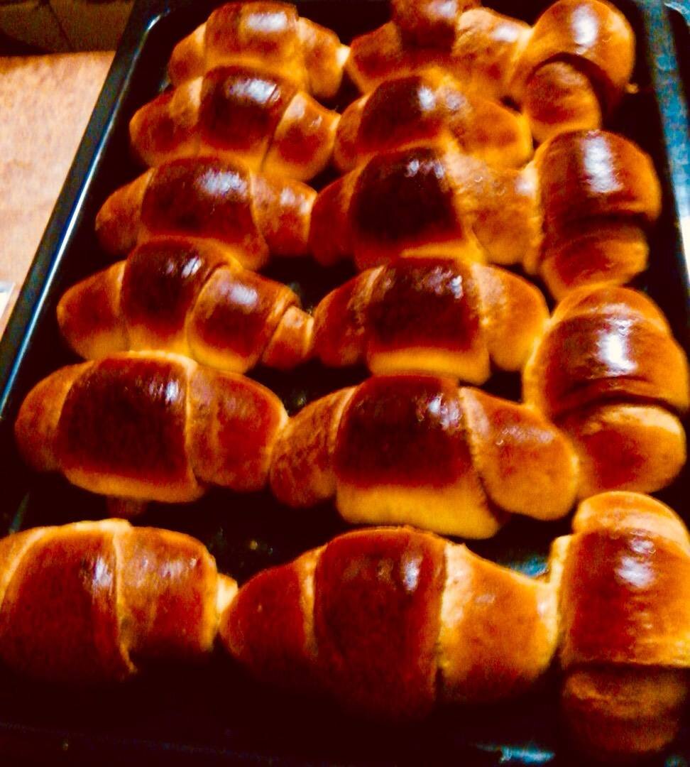 Очень быстрое сдобное тесто. Ингредиенты: яйца (+ одно для смазки рогаликов), молока, маргарина, растительного масла, сахара, муки, Ванилин, сухих дрожжей, разрыхлителя, джем Способ приготовления: В тёплое молоко добавить ст ложку сахара и дрожжи. Перемешать и оставить на 10 мин. Яйца взбиваем с сахаром. Добавляем растопленный тёплый маргарин, растительное масло и 2 г ванилин. Хорошо взбиваем. Вливаем молоко с дрожжами и ставим разрыхлитель. Опять взбиваем. Постепенно всыпаем просеянную муку и замешиваем мягкое тесто. Месим минут 10. Укутываем тесто оставляем в теплое место на 45 минут. За это время тесто хорошо подымается. Перекладываем тесто на стол присыпанный слегка мукой. Немного подминаем и делим на 6 частей. Формируем колобки. Раскатываем их толщиной в 5 мм. Каждый пласт нарезаем на 6 треугольников. На каждый треугольник кладём кусочек джема и скручиваем рогалики.🥐 Накрываем полотенцем и ждём 20 мин. Пока греется духовка. Смазываем рогалики взбитым яйцом с молоком и выпекаем 25