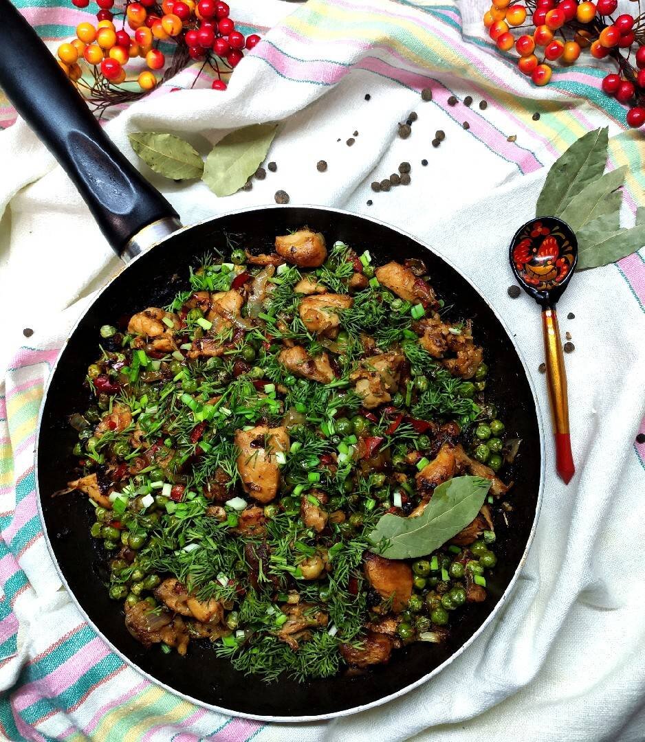 #23февраля #фотоурок6 Ингредиенты: свежего, замороженного зелёного горошка, куриного мяса, луковицы, Перец сладкий (можно мороженный, Соль, перец , сушеного томата, итальянских трав, Растительное масло для жарки Способ приготовления: Нарезаем мясо средними кусочками и обжариваем на масле до полуготовности. Добавить лук, нарезанный на полукольца или в четверть. Обжарить на небольшом огне под крышкой до прозрачности лука. Добавить перец нарезанный на полосочки. Также добавить соль и перец по вкусу, сушеный томат и травы. Можно добавить приправу к курице или карри. Тушим 5 минут. Добавляем горох и тушим до готовности ещё мину 5-10. Приятного аппетита 🤗