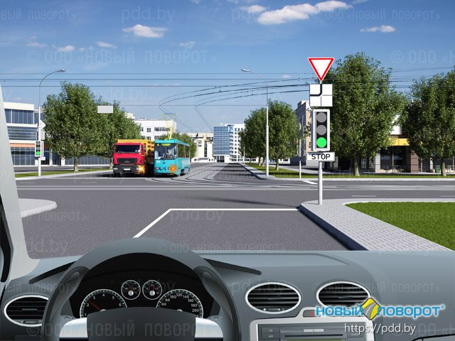 Ответ: Показанный на рисунке перекресток является регулируемым (поэтому в показанной ситуации дорожные знаки приоритета только информируют участников дорожного движения о том, что перекресток является обозначенным), так как перед ним установлен работающий светофор, зеленый сигнал которого разрешает Вам движение. Обычный светофор с круглыми сигналами и без дополнительных секций (как на рисунке) не обеспечивает бесконфликтное регулирование дорожного движения. Левый поворот в этом случае осуществляется методом «просачивания» через транспортный поток, движущийся со встречного направления. Поэтому Правила в целях обеспечения безопасности дорожного движения требуют от водителей транспортных средств, кроме трамвая, при левом повороте (грузовой автомобиль) уступать дорогу транспортным средствам, движущимся со встречного направления прямо или направо (Ваш автомобиль). Наличие такого требования обусловлено стремлением сохранить единый принцип разъезда транспортных средств в случаях пересечения их траекторий — уступает дорогу тот, кто изменяет направление движения. При равном праве на движение трамвай имеет преимущество перед другими транспортными средствами независимо от направления его движения, поэтому первым перекресток должен проехать трамвай. Таким образом, намереваясь продолжить движение прямо, Вы должны уступить дорогу только трамваю.