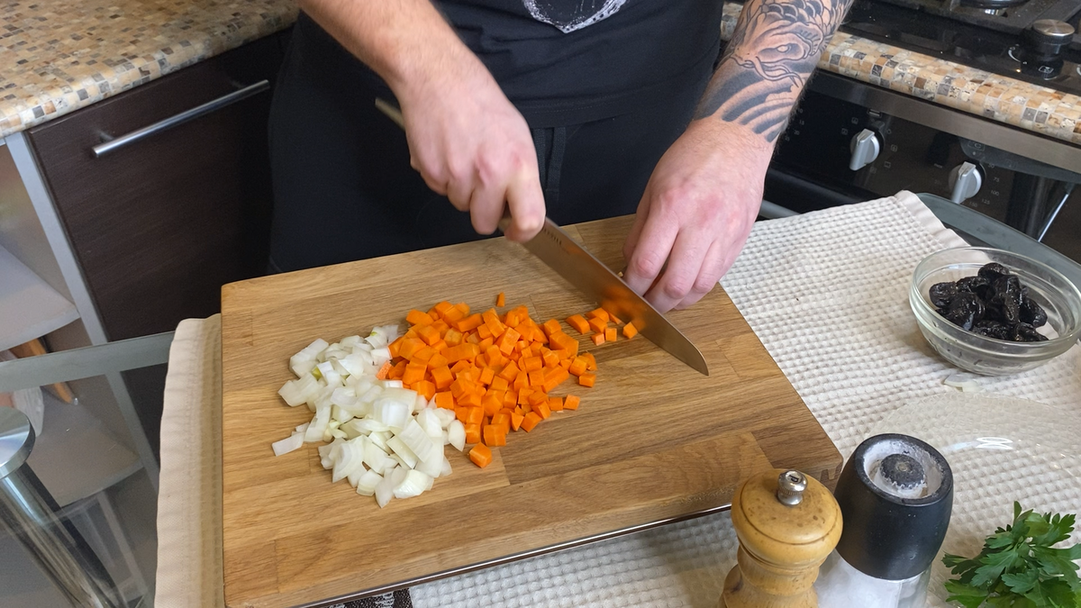 Сегодня мы не просто приготовим гарнир из булгура, а мы научимся делать его абсолютно с чем угодно. Фишка в том, что нам нужно запомнить одну простую истину, о которой напишу ниже. Мы с женой сняли видео, где я наконец-то осмелел и сверкнул своими большими щеками. Мы, конечно, больше ржали, чем говорили по делу. Видео можно посмотреть на ютубе (ссылка), прошу сильно не пинать и написать свое мнение. Хотим продолжать в таком же формате. Булгур у нас получится мега вкусный. Так что погнали. Гарнир из булгура Итак, для начала нарежем лук и морковку. Режем все равно каким кубиком, а можно и соломкой - без разницы. Фотки, кстати, из видео. Сразу закидываем жарить овощи. Можно жарить и на растительном и на сливочном масле. Пока овощи жарятся мы нарежем чернослив. Это будет нашей изюминкой, так как он прекрасно сочетается с этой крупой. Чернослив обязательно нужно промыть. Так как там может попадаться всякая гадость скрипящая на зубах. Овощи готовы, а значит пора добавлять чернослив. Обжари