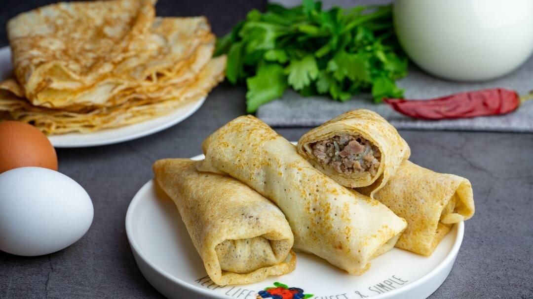 Блины из заварного теста с мясной начинкой