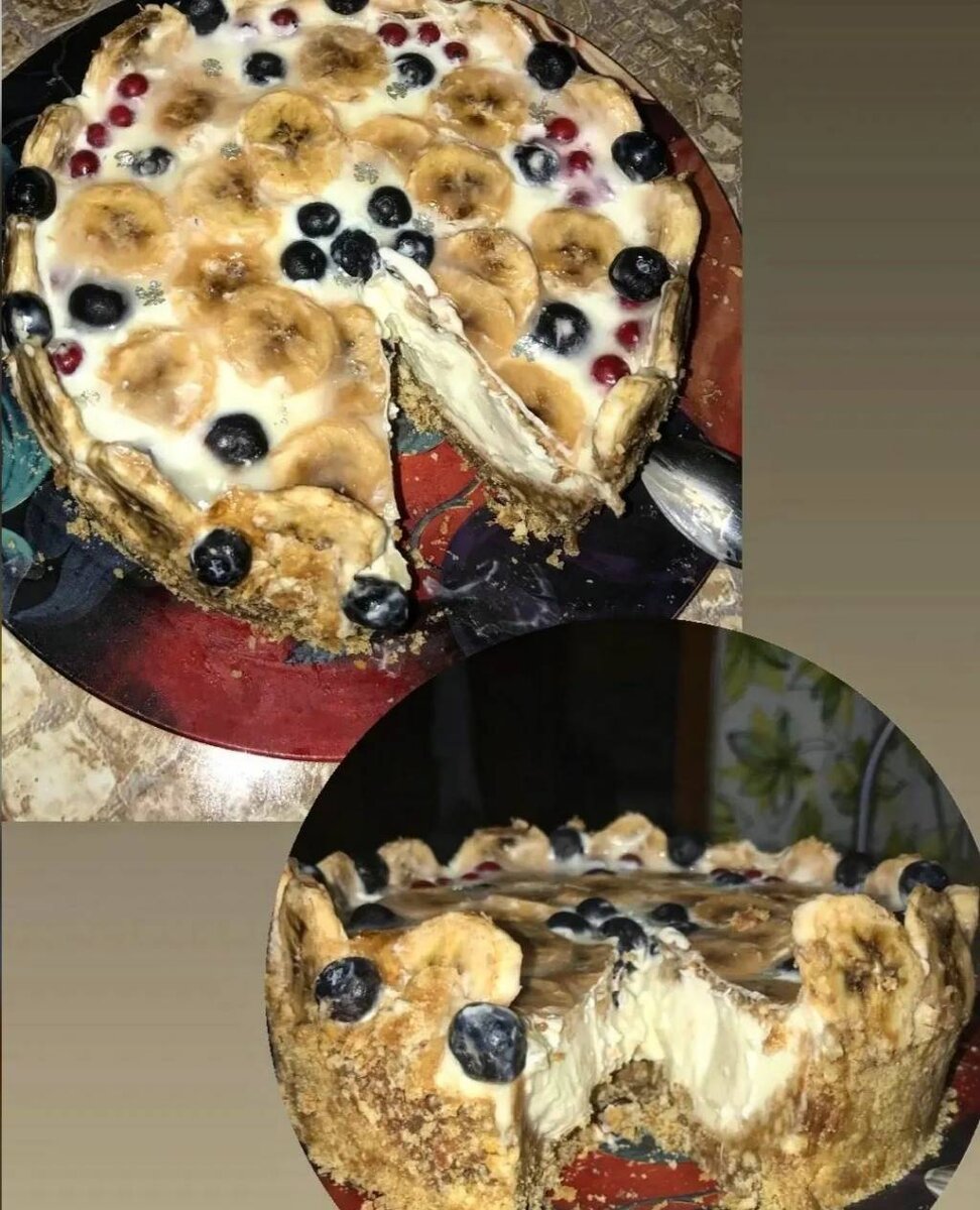 Ингредиенты: Основа, сливочного печенья, сливочного масла, Начинка, сливочного сыра, сливки 50% , сахарная пудра, бананов, желатин Способ приготовления: Основа: 1.Печенье раскрошить, добавить мягкое сливочное масло и перемешать до однородности. 2.Высыпать крошку разъемную форму и утрамбовать. Убрать форму в холодильник. 3.Начинка: Желатин залить 40 мл холодной кипяченой воды и оставить набухать.Варить как указано на желатине. 4.Творожный сыр соединить с сахарной пудрой, очистить бананы порезать из мелко, добавить сливки. 5.Взбить миксером на низкой скорости до однородности. 9.Опять сварить желатин, можно с ароматизатором и вкусом, немного, залить верхушку, украсить и поставить в холодильник на 3-5 часов. 10.Достать торт из холодильника. Снять кольцо. 11.Готово!Приятного аппетита! 6.как желатин сделался, при постоянном помешивании влить растопленный желатин в сырную массу. 7.Вытащить основу из холодильника,выложить начинку на основу. 8.Убрать в холодильник на час.