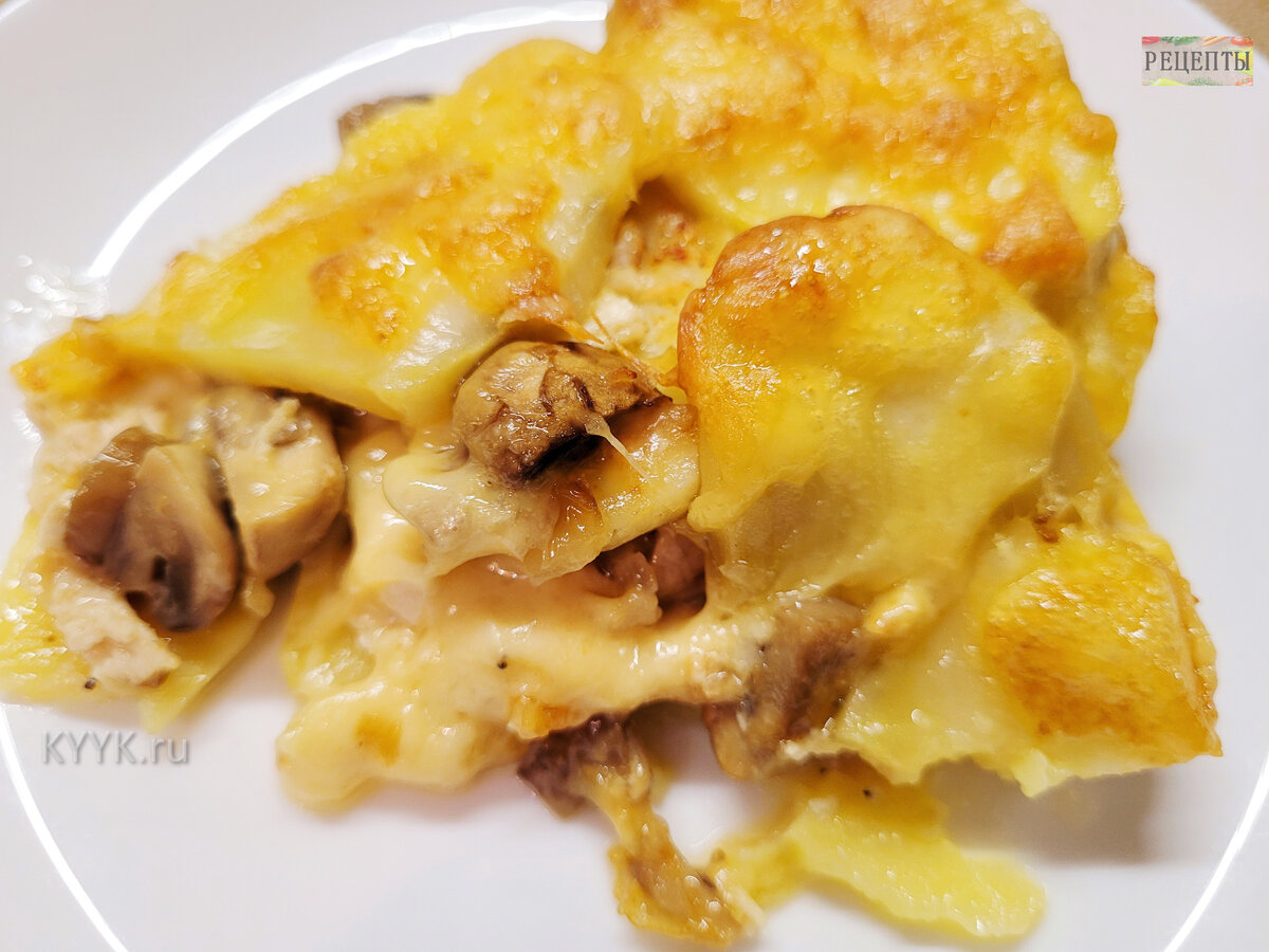 Запеканки – это вкусные и несложные в приготовлении блюда, которые имеют бесконечное число комбинаций ингредиентов. Благодаря этому, без лишних усилий, можно, хоть каждый день, готовить что-то новенькое. А главное, блюда в духовке - это полезно. Сегодня поговорим о запеканке с курицей и грибами. Все ингредиенты вы найдете в конце статьи. Пошаговый рецепт. Овощи очистить и вымыть, грибы вымыть и обсушить. Куриную грудку предварительно отварить, сварить из нее легкий куриный бульон. Лук мелко нарезать и обжаривать на среднем огне в небольшом количестве масла. Грибы нарезать четвертинками, если мелкие, пикулями, если крупные. Кода лук подрумянится, добавить в него грибы. Обжаривать все вместе, до золотистого, на среднем огне без крышки. А пока, в форму для запекания слайсами нарезать картофель, сбрызнуть его оливковым маслом, если нет оливкового, подойдет любое растительное рафинированное, присыпать солью, перцем, можно другими специями по вкусу. Куриную грудку мелко нарезать. Выложить