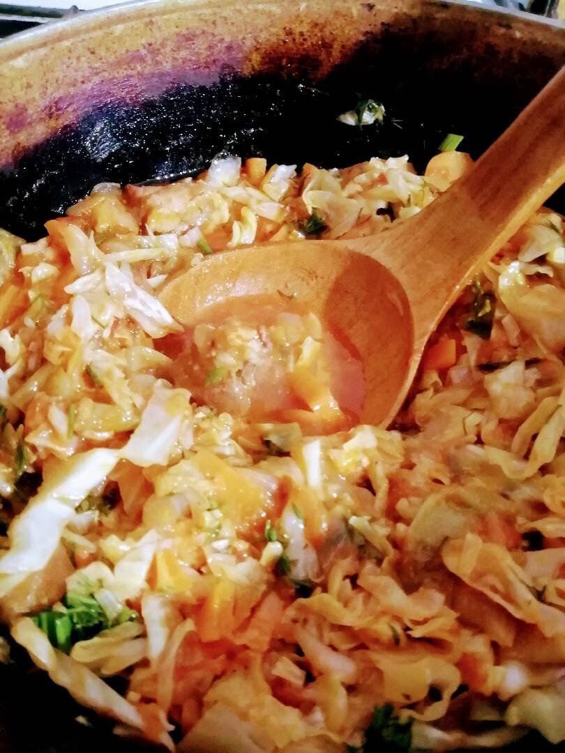 Тушёная капуста со свининой в соусе "Дыхание весны"