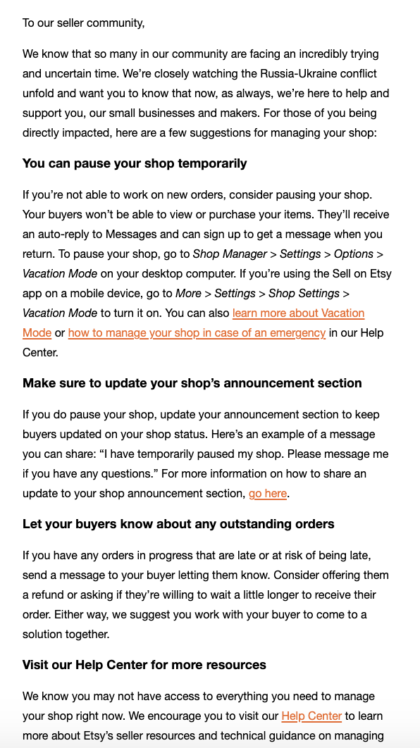 Письма поддержки от Этси для России и Украины! На почту продавцам из России и Украины пришли Supporting sellers письма. Что в них? Для России: - Что следят за конфликтом, и стараются поддержать мастеров и их дело. - Если вы не можете отправлять заказы, то отправьте магазин в отпуск. - Если задерживаете сроки, сообщите клиенту. - Если не можете отправить заказ, отмените его. ЕСЛИ У ВАС НЕТ ПРОБЛЕМ С ОТПРАВКОЙ, В ОТПУСК МАГАЗИН ОТПРАВЛЯТЬ НЕ НУЖНО! РАБОТАЙТЕ ДАЛЬШЕ! ВСЁ ОК!!! Для Украины: - Все магазины будут отправлены в отпуск автоматически. Вы можете его оттуда вывести, если можете принимать заказы. " Мы временно приостанавливаем работу вашего магазина. Мы знаем, что выполнение заказов сейчас может быть затруднено, поэтому мы автоматически отправили ваш магазин в отпуск. Если вы можете продолжать работу, то выведите его из режима отпуска вручную." - Комиссии за февраль обнулены Это очень хорошая новость, учитывая, активные и неадекватные призывы, заблокировать магазины людей из России