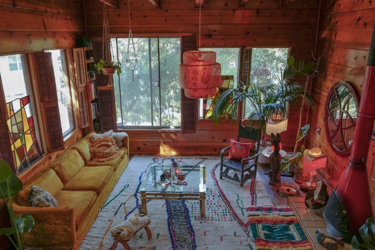 Диковинный дом 1950-х годов в Лос-Анджелесе с ярким дизайном, окруженный пышной растительностью.