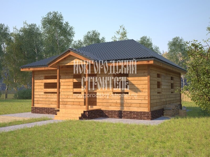Одноэтажный дом - хорошее решение для тех, кто не любит лестницы. В этом срубе, возводимом "под усадку" помещений для комфортного проживания, даже при наличии всего одного этажа. Размеры дом - 8х8 м без крыльца - дают возможность устроить в нем сразу три спальни, большую кухню-гостиную и санузел. Кроме того, остается приличных размеров холл и тамбур. При желании перегородки внутри дома можно слегка сдвинуть, уменьшая размеры холла и увеличивая габариты комнат. Крыльцо, небольшое в базовой планировке, можно расшить до полноценной веранды. Небольшой удельный вес сруба из профилированного соснового бруса позволяет обойтись без капитального фундамента, ограничиваясь винтовыми сваями или опорными блоками. Нижние венцы и основание дома пропитываются антисептиком. Будучи при этом приподняты над грунтом, они в достаточной мере защищены от почвенной влаги. Фронтонов у дома как таковых нет, поэтому все строение полностью срублено по технологии "в теплый угол", без традиционно используемых монтаж