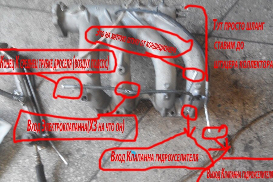 Один конец трубки цепляется к средней трубке дроселя это идет подсос воздуха из-за дроселя, дальше по ней идет выход на какой-то элетроклапан(подскажите зачем он, так и не понял) получается он дает воздух в коллектор по какому-то сигналу, дальше трубка уходящая вниз идет на клапан на Гуре, это клапан увеличения холостых оборотов при прокрутке руля, То что помечено красной стрелкой это значит если в указаном напралении подать высокое давление(у меня есть продувочный пистолет) воздуха то от туда вылетает металлический стержень с резиночками, тоесть если его вытащить то масло пойдет в ваукумную систему, я это учитывал и поставил этот выход клапана на вход от дросельной заслонки дальше от этого клапана второй выход подключаем, так сказать к "переходу" и дальше уводим в коллектор, вторая толстая трубка которая смотрит вверх это на хитрую штуку с ваукумом и винтом от кондиционера(у меня ее нет, и кондера нету, поснимал уже все) ну впринцепи остается подключить к тоненьким выходам от коллекто