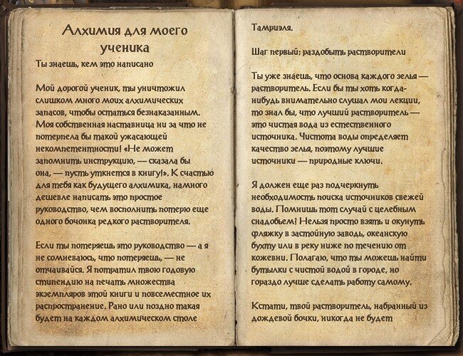 Если ты потеряешь это руководство - а я не сомневаюсь, что потеряешь, - не отчаивайся. Я потратил твою годовую стипендию на печать множества экземпляров этой книги и повсеместное их распространение. Рано или поздно такая будет на каждом алхимическом столе. Тамриэля.