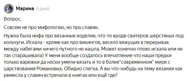 А если серьёзно, говоря о славянах и скандинавах, непредвзятому (подчёркиваю, непредвзятому!) исследователю подчас бывает сложно отличить продукты скандинавского ремесла от продуктов славянского (на эту тему рекомендую почитать статьи Андрея Пауля, здесь можно распинаться очень долго). К тому же викинг – это не национальность, а, скажем так, род деятельности, и в числе викингов случались славяне. Да и культурный обмен, торговля среди славян и скандинавов имели место быть. Так что, говоря о том, что одни вязали уже в период с VIII по XI век, можно с большой долей вероятности говорить и о том, что тем же самым занимались и другие в то же время.